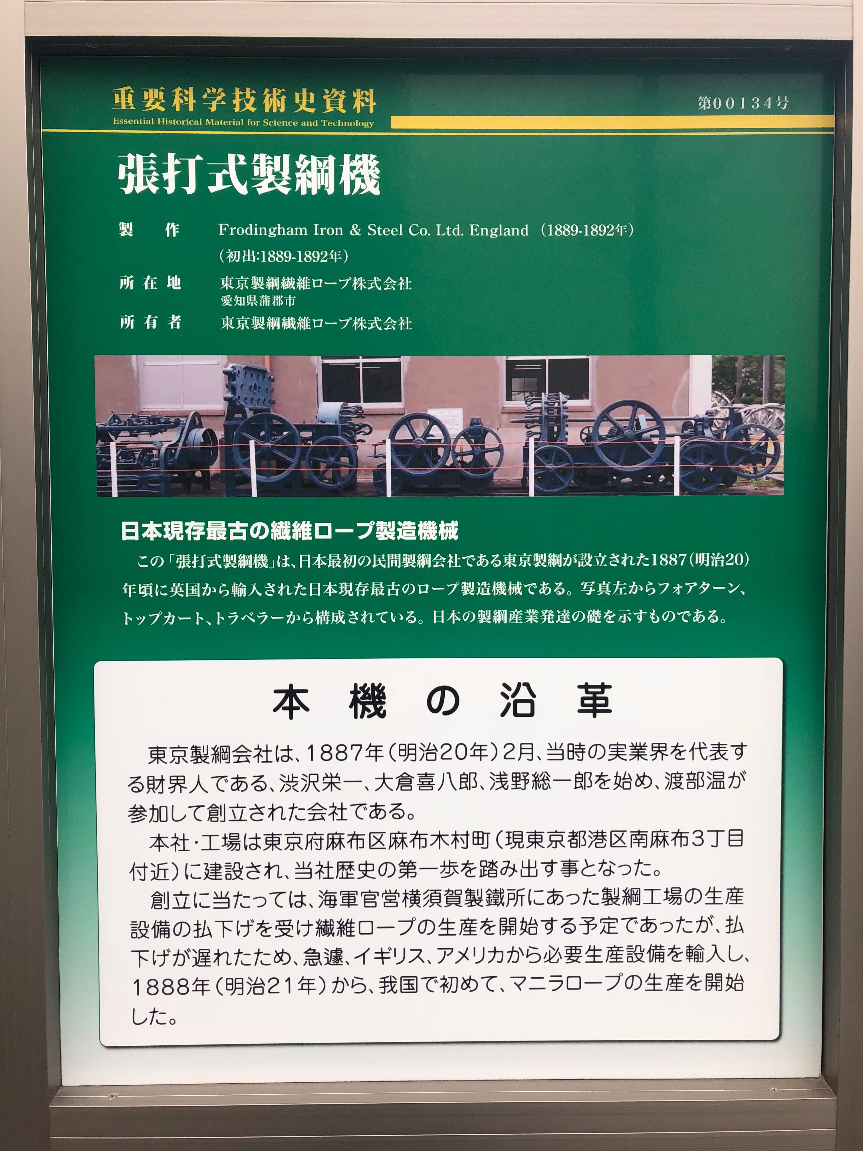 日本の製綱産業発達の礎を示す資料として国立科学博物館の重要科学技術史資料(愛称:未来技術遺産)に登録されました。